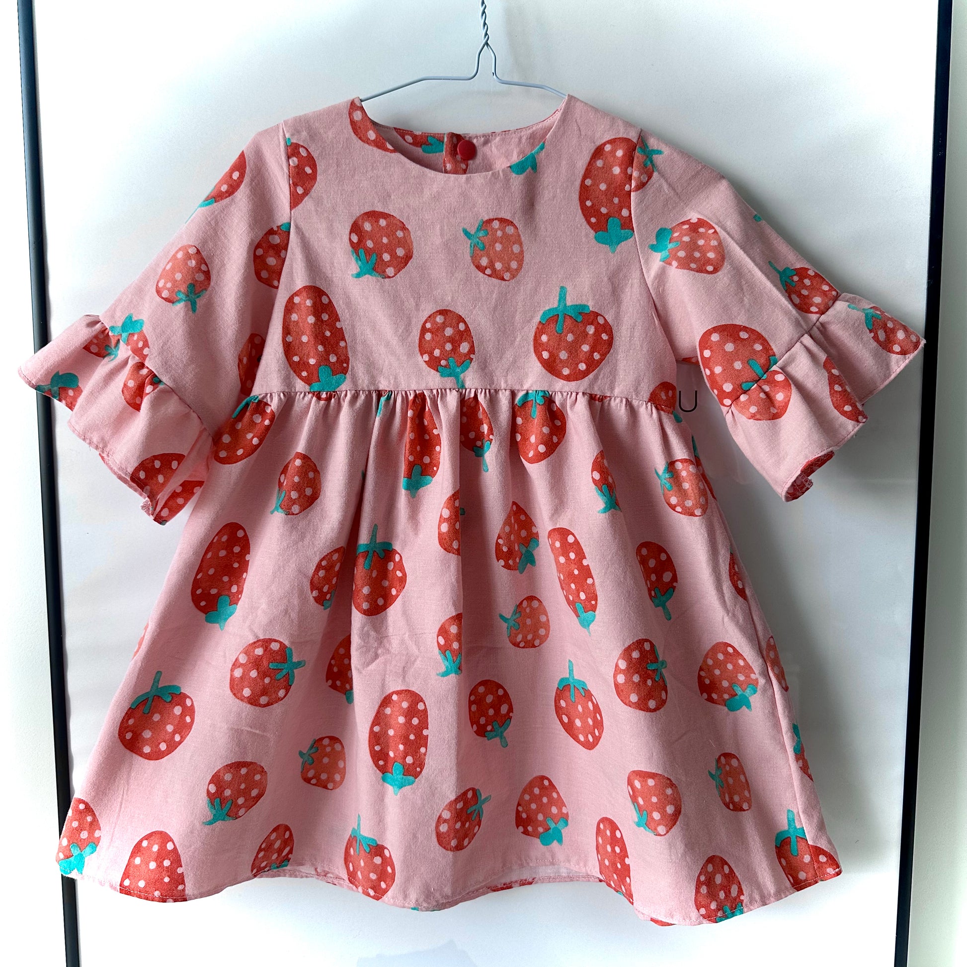 Handmade Smock Dress with Ruffles (2–3 Years) – Strawberry Print